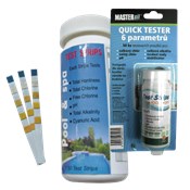 jednoduchý proužkový tester pro měření obsahu volného a vázaného chloru, alkality, pH, stabilizátoru a tvrdosti v bazénové vodě.