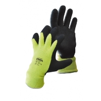 Zateplené pletené bezešvé nylonové rukavice s vrstvou mikorporézního paropropustného latexu v dlani a na prstech a pružným nápletem na zápěstí.