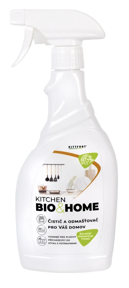 Kitchen BIO & HOME je ekologický čistící prostředek, který je vhodný pro čištění veškerých omyvatelných kuchyňských i jiných ploch, včetně barevných kovů, lakovaných povrchů, hliníku a skla. Velmi efektivně odstraňuje oleje, tuky, pryskyřice a jiné nečistoty. Neobsahuje hydroxid, fosfáty a chlorované uhlovodíky.